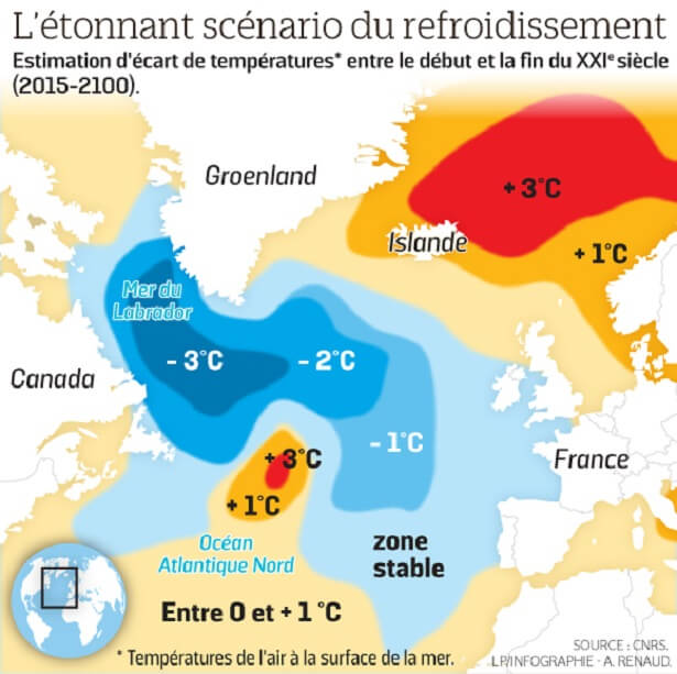 Si la planète a tendance à se réchauffer globalement, ce n’est pas le cas partout. Il est d’ailleurs plus exact de parler de dérèglement climatique plutôt que de réchauffement. La façade Atlantique française connaîtrait par exemple, au cours des prochaines années, un phénomène de refroidissement.