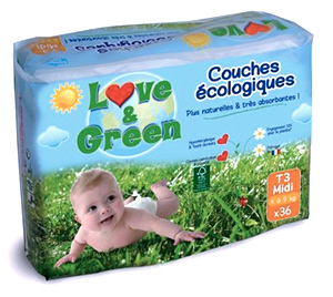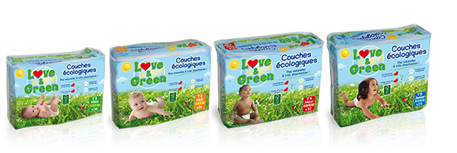 Lancée en 2011 dans les magasins Leclerc, la marque de produit d’hygiène écologique Love & Green propose ces couches écologiques partout en France dans différents points de vente (Leclerc, SuperU, Intermarché…).