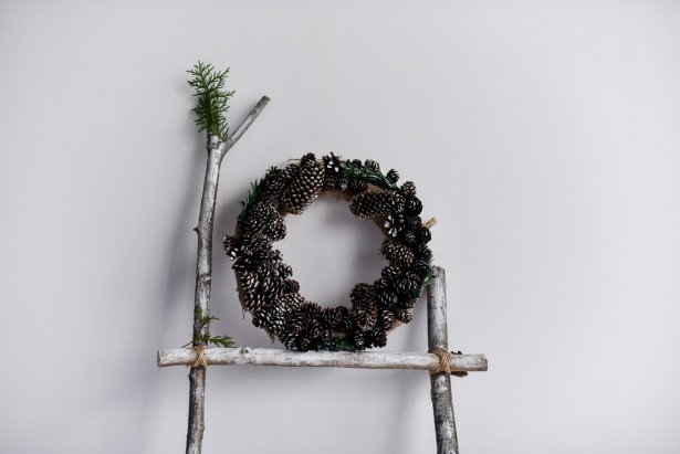 Pour débuter et se faire la main plus facilement, on peut aussi utiliser un cintre, un morceau de grillage ou du fil de fer. Décorez ensuite le tout avec des écorces, des plumes, des feuilles mortes, des pommes de pin, ou encore avec des objets de Noël dénichés (ou fabriqués) dans les tiroirs : petits paquets joliment emballés, morceaux de guirlandes et boules recyclées des années précédentes, peluches, petits jouets…