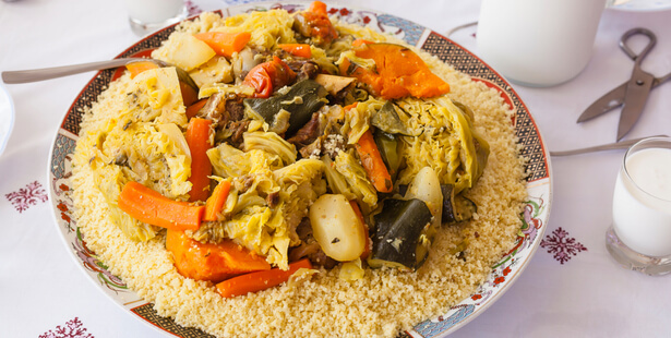 Plat berbère originaire du Maghreb, le couscous se prépare pour garnir une base de semoule de blé dur. Au Maroc, il en existe des centaines de recettes, toutes plus délicieuses les unes que les autres… Pour cette recette, nous avons choisi de nous passer de la viande et de relever la préparation d’une aromatique pointe de cannelle. Un épice que l’on retrouve d’ailleurs dans deux autres succulentes recettes, spéciales hiver : le velouté de carottes et le chou-fleur à la cannelle.