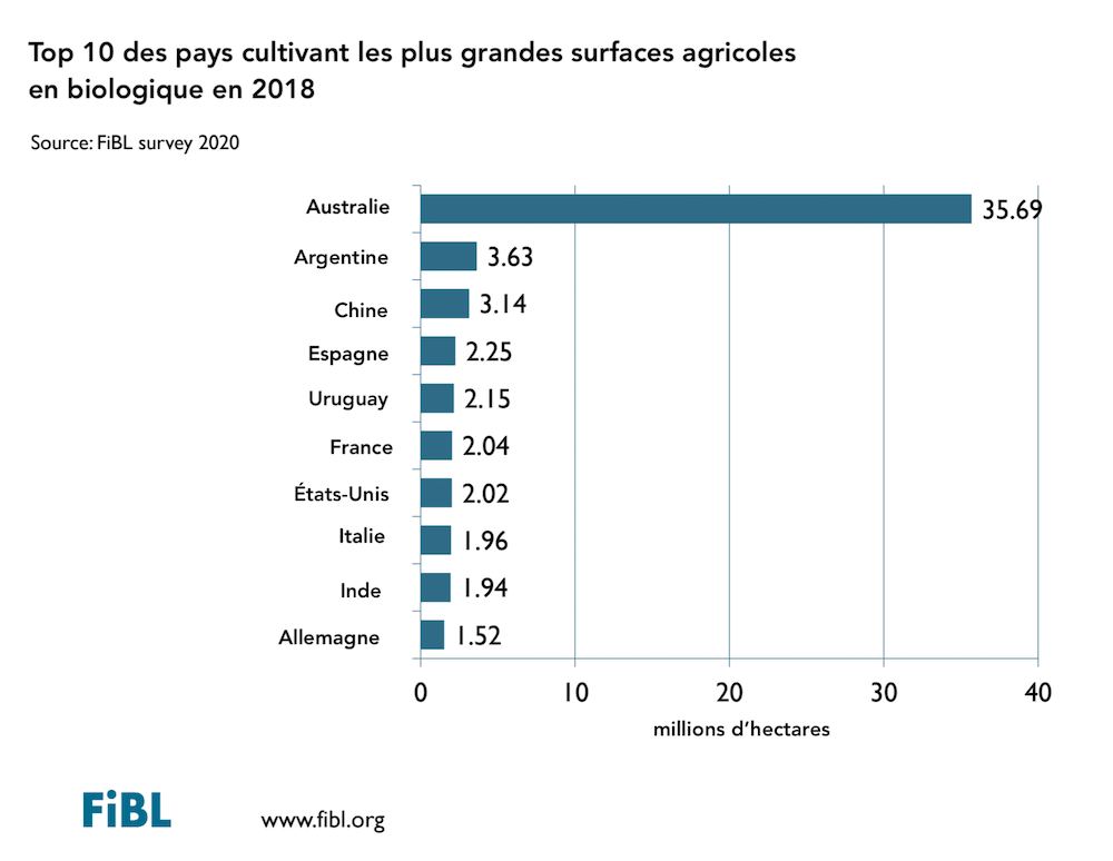 L’Australie possède la plus grande surface agricole biologique (35,7 millions d’hectares), suivie de l’Argentine (3,6 millions d’hectares) et de la Chine (3,1 millions d’hectares). L’Europe représente 15,6 millions d’hectares cultivés, suivie par l’Amérique latine (8 millions d’hectares).