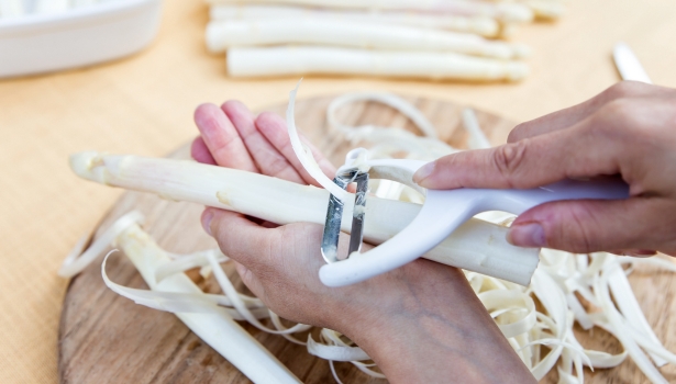 Pour bien éplucher les asperges, utilisez un épluche-légumes et commencez juste en dessous de la pointe, en descendant vers le bas de la tige. Arrêtez-vous lorsque vous n’avez plus de résistance.