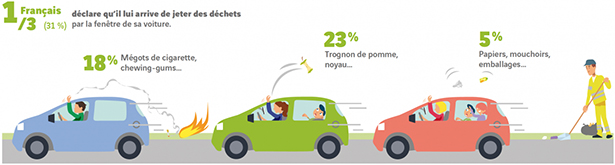 Une partie du sondage portait sur les comportements au volant et là encore, les chiffres sont inquiétants même s’ils sont en amélioration par rapport à l’année précédente : en 2016, un Français sur trois déclare jeter des déchets directement par la fenêtre. En tête les restes organiques, comme les trognons, les peaux ou les noyaux de fruits (23 %), puis viennent les mégots et les chewing-gum (18 %), mais aussi les papiers, mouchoirs et emballages divers (5 %).
