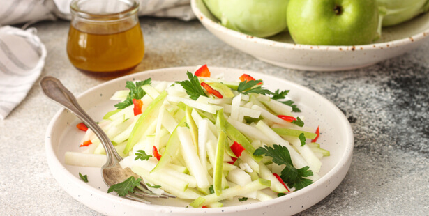 Fines tranchettes de dos de lieu mariné au citron, mayonnaise légère à la mangue, salade de chou-rave à l’huile de noisettes