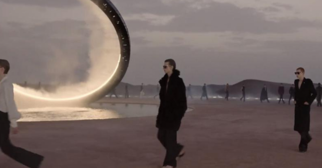 Peu avant la tombée de la nuit, les quelque 200 invités ont pu voir des mannequins défiler sur une dalle de béton circulaire, autour d’une piscine, également circulaire, construite pour l’occasion. Les brumisateurs ajoutaient une touche mystique à ce décor lunaire. Le spectacle s’est conclu avec un immense anneau lumineux surgissant du plan d’eau, puis s’élevant en position verticale. Parmi les invités, les journalistes ont aperçu les acteurs et actrices Béatrice Dalle, Catherine Deneuve et Dominic Fike.