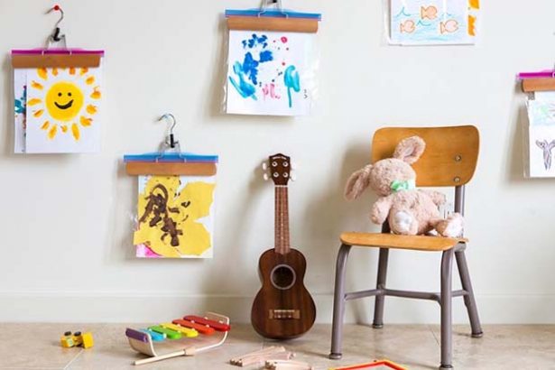 Il fallait y penser mais le résultat est surprenant ! Procurez vous quelques cintres à pinces en bois et accrochez-y les dessins de vos enfants. Plantez quelques clous et le tour est joué. En plus d’amener dans votre intérieur une déco originale, ce système est très pratique car il vous permettra de changer rapidement les dessins lorsque vous souhaiterez en afficher de nouveaux.