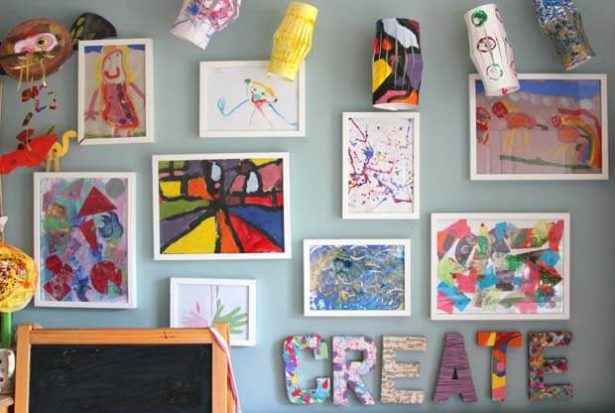Et si vous mettiez à disposition de votre enfant un mur dans la maison pour exposer ses plus beaux dessins ? Variez les tailles et les couleurs des cadres et laissez lui organiser comme bon lui semble sa propre galerie d’art.