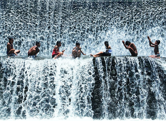 Des enfants Balinais se lavent sous la cascade de Tukad Unda en Indonésie.