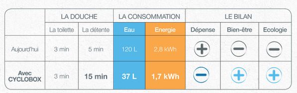 - mais aussi d’une nouveauté qui économise l’eau en recyclant et en réutilisant quasi en simultané l’eau pendant la douche