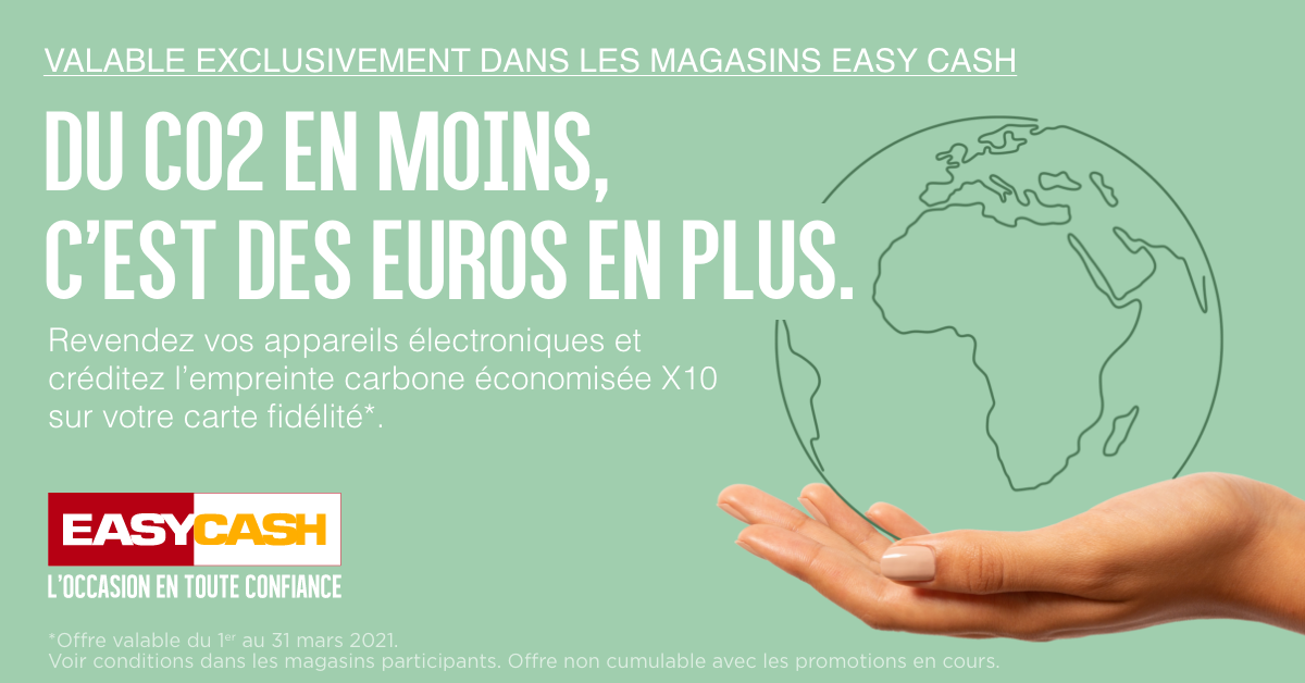En effet, avec sa nouvelle opération, Easy Cash récompense vos efforts en faveur de la transition écologique. En revendant vos appareils fonctionnels dans un magasin Easy Cash, non seulement vous pouvez gagner de l’argent mais vous pourrez aussi profiter des économies sur les émissions de CO2 ainsi réalisées.