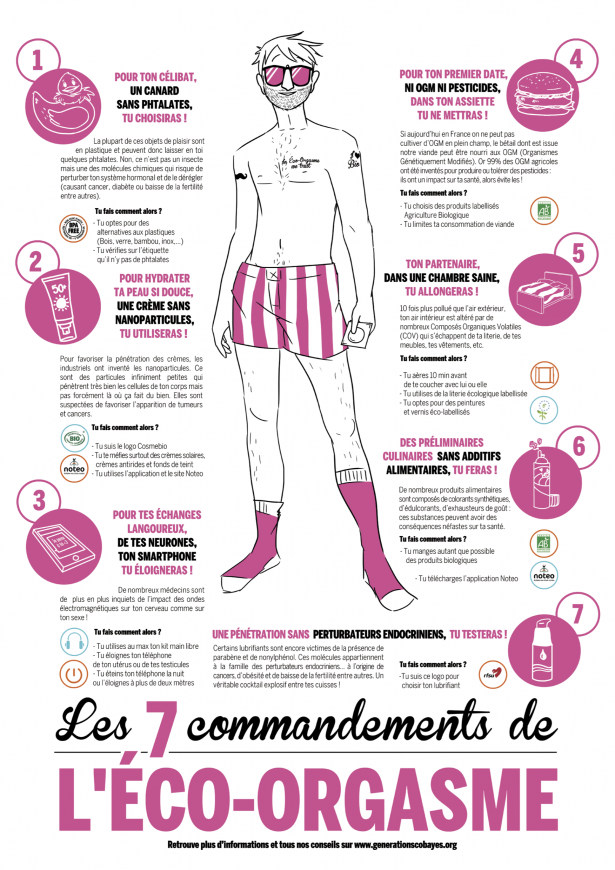 Le regroupement d’associations Générations Cobayes a dressé il y a quelques années une campagne de prévention santé à destination de tous. Leur slogan : « Pour que l’on puisse tous continuer à se faire du bien sans se faire du mal ». Bienvenue dans le monde de l’éco-orgasme.