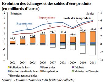 2009 a donc vu une baisse notable des échanges d’éco-produits, avant que ceux-ci ne repartent à la hausse en 2010. Cette augmentation s’est confirmée en 2011 : +11 % pour les exportations d’éco-produits et +14 % pour les importations par rapport à l’année précédente.