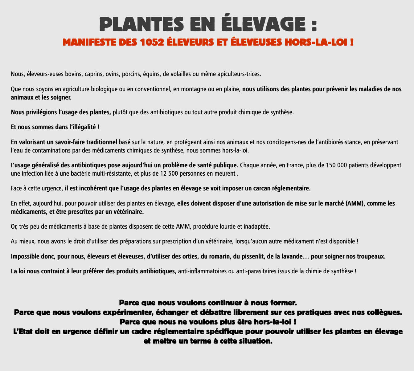Le manifeste des 1.052 éleveurs et éleveuses hors-la-loi permet de comprendre le caractère urgent de la mise en place d’une nouvelle réglementation concernant l’usage des plantes pour prévenir les maladies des animaux et les soigner.