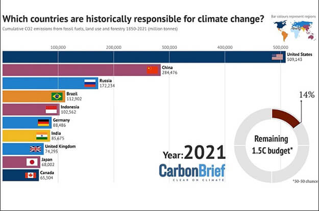Au fil de l’histoire, les États-Unis ont donc été responsables de 20,3 % de l’ensemble des émissions de CO2, la Chine de 11,4 %, la Russie de 6,9 %, le Brésil de 4,5 %, l’Indonésie de 4,1 %, l’Inde de 3,4 % et le Royaume-Uni de 3 %.