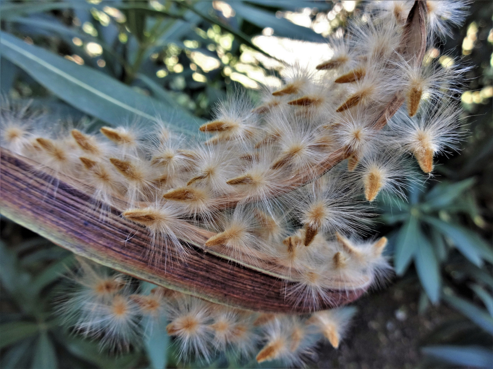 Le laurier-rose appartenant à la famille des Apocynacées, certaines de ses fleurs produisent des fruits et des graines après la floraison. Ces fruits prennent la forme de gousses vertes qui ressemblent à des haricots verts. Les gousses, d’abord vertes et dures, s’allongent progressivement avant de sécher pour devenir marron ou noires en hiver. Lorsqu’elles sont mûres, elles s’ouvrent et libèrent de nombreuses petites graines plumeuses. Le vent emporte une partie de ces graines, tandis que d’autres restent collées aux gousses.