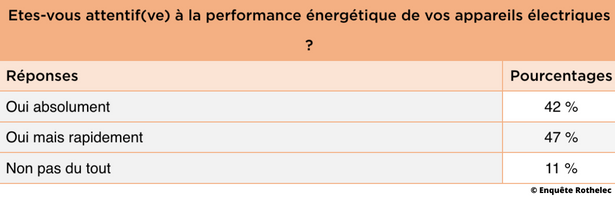 Toujours est-il que globalement (89 %), les Français déclarent être attentifs à la consommation énergétique des appareils électroménagers lorsqu’ils cherchent à en acheter un nouveau. 42 % se disent très soucieux des leurs performances énergétiques, et 47 % s’y disent relativement attentifs. Seulement 15 % n’y prêtent aucune attention.
