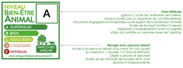 L’étiquetage proposé présente le mode d’élevage sous forme de pictogramme ainsi qu’une échelle à cinq niveaux : le niveau de bien-être animal (couleur verte ou violette), les cinq niveaux d’évaluation du bien-être animal, une note (de A à E), le mode d’élevage (parcours arboré, accès extérieur, bâtiment amélioré, bâtiment en progrès ou en bâtiment).