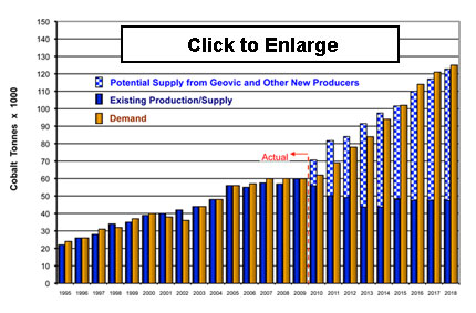 Le marché du cobalt est dynamique mais petit comparé aux autres métaux de base. Cependant, les besoins en cobalt vont augmenter, poussés par la voiture électrique. Selon le groupe minier Geovic :« La croissance la plus rapide [des besoins de cobalt] avec l’utilisation de batterie est le secteur des véhicules électriques hybrides (et potentiellement les véhicules électriques ou les véhicules exclusivement électriques)… L’option « plug-in » des véhicules électriques hybrides est encore plus écologique et comprend une batterie en cobalt supplémentaire pouvant être chargée depuis une prise électrique. ».