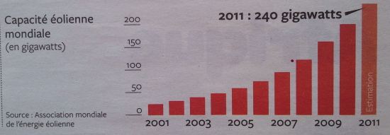 Conséquence, l’éolien s’essouffle en France : on a construit -70 % d’éoliennes au premier trimestre 2012 et on s’engage dans un programme d’éoliennes géantes off shore plutôt que de taille modeste bien réparties sur le territoire ! (9)