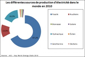 (5) La production totale nette d’électricité s’élève à 548,8 TWh, soit -0,2 % par rapport à 2005. Elle se répartit en 428,7 TWh nucléaires (78,1 %), 57,1 TWh thermiques classiques (10,4 %), 60,9 TWh hydrauliques (11,1 %) et 2,2 TWh éoliens et photovoltaïque (0,4 %). » Source : http://www.industrie.gouv.fr/energie/statisti/se_elec.htm