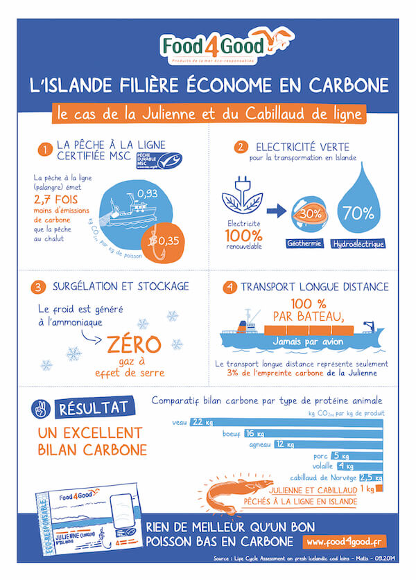 Le Cabillaud et la Julienne d’Islande Food4Good démontrent un Bilan Carbone© particulièrement faible, ils ne génèrent que 1 kg COeq par kg de produit. C’est très faible, quand 1 kg de veau génère 22 kg COeq et de la volaille 4 kg COeq.