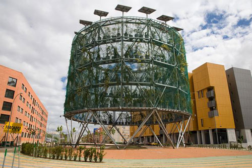 Dans la banlieue de Madrid, à Vallecas, la tour Air Trees est fabriquée à base de matériaux recyclés. Elle est composée de panneaux photovoltaïques chargés de produire de l’énergie, et d’arbres produisant de l’oxygène.