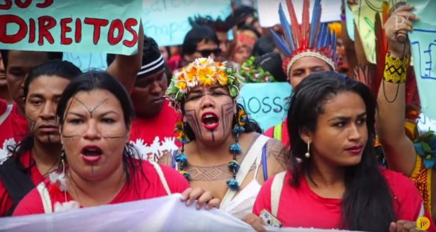 Protestation pour la sauvegarde des territoires et de la culture Guajajara (au centre de la photo : Sônia Guajajara, militante, infirmière, enseignante, femme politique) – Capture d’écran Agência Pública
