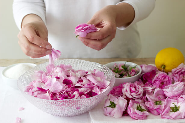 Pour préparer votre gelée de roses, récoltez délicatement les plus beaux pétales tout frais d’une vingtaine de roses et coupez leur base blanche.
