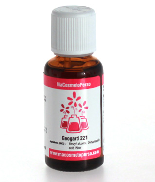 Enfin, s’il est compatible avec toutes les matières premières, il ne l’est pas avec tous les contenants ! Attention donc de ne pas utiliser le conservateur avec un flacon en plastique type PET. Pour incorporer le Cosgard ou Geogard 221 dans une préparation, il faut dans un premier temps transvaser le produit dans un bol inox. Ensuite, ajouter le conservateur, agiter longuement jusqu’à dissolution complète du Cosgard, puis retransvaser le produit dans le flacon.