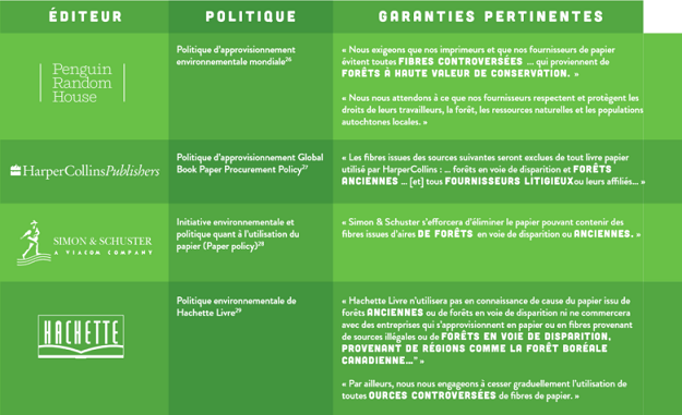 Dans un rapport(1) publié par Greenpeace, on apprend que de grandes maisons d’éditions internationales s’approvisionnent en produits papier auprès de Résolu. Étant donné les grands progrès qui ont été réalisés récemment en matière de recyclage et de production durable du papier, on est en mesure de penser que les éditeurs ne respectent pas les engagements qu’ils ont pris eux-mêmes vis-à-vis du public et de la planète.