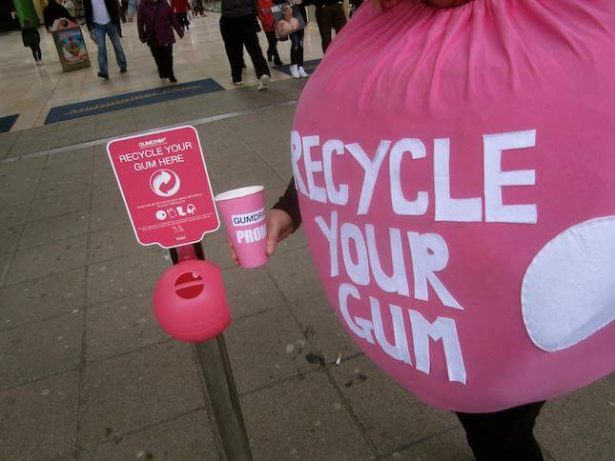 Les chewing-gums, jetés n’importe où, ont envahi les sols. La Britannique Anna Bullus a eu une idée : les recycler en objets comme des gobelets, des semelles de chaussures et des crayons. Son entreprise Gumdrop installe des petites poubelles roses pour collecter ces déchets polluants.