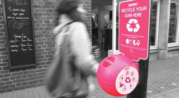 La designer britannique Anna Bullus a eu une idée pour lutter contre la pollution liée aux chewing-gums : les collecter et les recycler en objets du quotidien. Elle a créé des Gumdrop, des poubelles elles-mêmes recyclées, de couleur rose et en forme de bulle. Un texte explique aux consommateurs leur utilité.