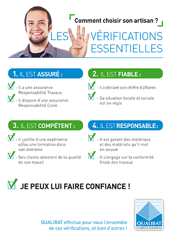 Il s’agit en réalité d’effectuer les vérifications dont un particulier a besoin avant de se décider dans le choix d’un artisan. Cela concerne donc l’assurance (Responsabilité Travaux, Responsabilité), la fiabilité fiscale et sociale, les compétences et la responsabilité. Les entreprises qualifiées QUALIBAT ont fait l’objet de vérifications soigneuses et sont contrôlées régulièrement.