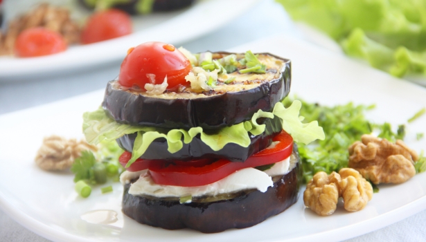 Superposez une autre rondelle d’aubergine grillée sur le dessus pour former le « burger ». Répétez l’opération pour créer autant de burgers que nécessaire.