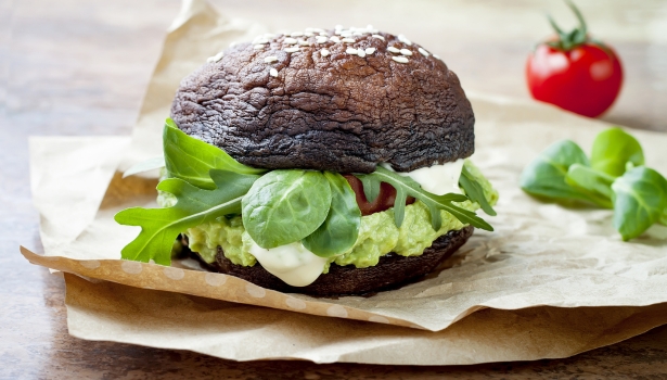 Voici une variante de la recette de burger sans pain, mettant en vedette des champignons portobello grillés, du guacamole, des légumes frais et une sauce au fromage.
