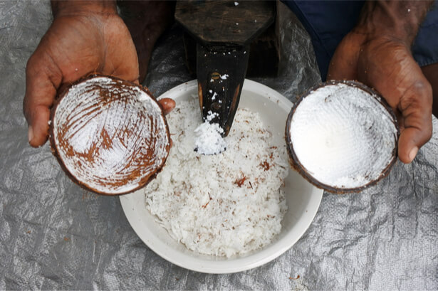 En effet, l’huile de coprah n’est pas la même chose : l’albumen est d’abord séché, puis raffiné, et l’huile est fabriquée par chauffage en utilisant des solvants. Elle est donc moins pure. On l’emploie par exemple pour faire du monoï de qualité médiocre.