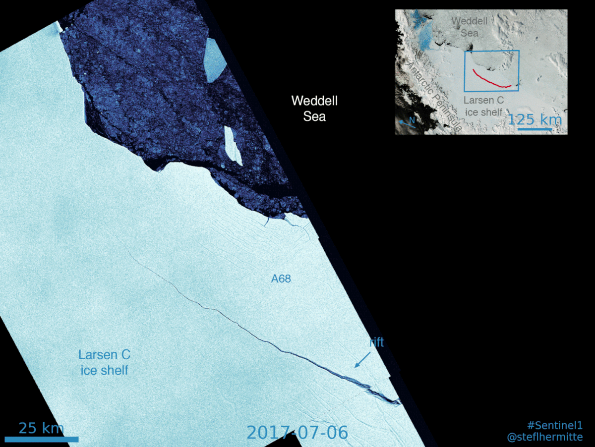 Ca y est : les scientifiques du projet MIDAS rapportent qu’entre lundi 10 et mercredi 12 juillet l’immense iceberg s’est finalement détaché de la plateforme de glace Larsen C. Ils l’anticipaient, après des mois d’observation grâce à des satellites européens. Si ce décrochage modifie pour toujours la carte du continent, l’iceberg n’aura pas d’effet immédiat sur le niveau des océans, car il reposait déjà sur l’eau.