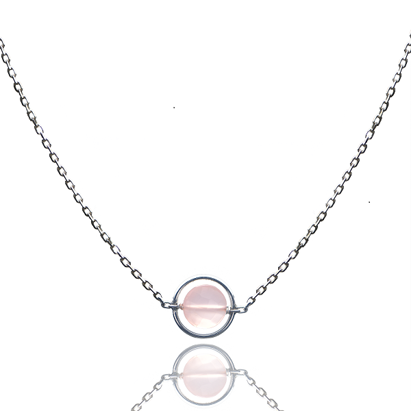 Collier « Me » en Calcédoine Rose : Dans la collection « Me », la pierre est taillée en rond facetté. La pierre est cerclée dans un anneau d’argent sans être sertie pour qu’elle puisse être mobile.
