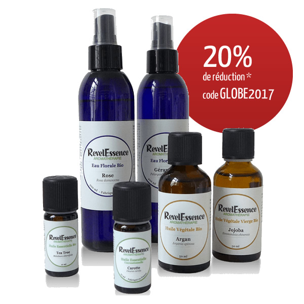 Pour profitez pleinement des vertus de l’aromathérapie bio au meilleur prix, RevelEssence offre aux lecteurs de consoGlobe.com une REMISE SUPPLÉMENTAIRE DE 20 % *sur votre première commande avec le code : GLOBE2017