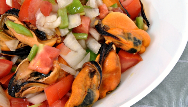 Coupez les légumes en petits dés, mélangez-les avec les moules, arrosez de jus de citron et d’huile d’olive. Parsemez de basilic ciselé et laissez reposer au frais 30 minutes avant de servir.