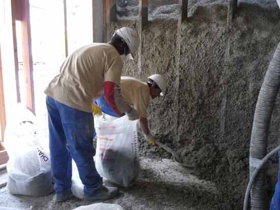 La projection n’est pas sans laisser des traces derrière elle. Les résidus de béton de chanvre sont ramassés afin d’être recyclés dans du nouveau matériau. (image : © Atelier D)