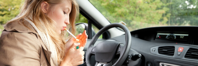 Illustration bannière : Femme allumant une cigarette au volant de sa voiture – © photomak