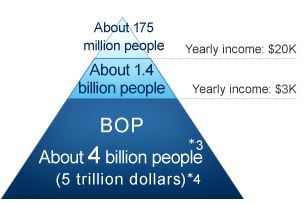 Selon le MITI japonais, les personnes gagnant moins de USD 3,000 en valeur parité de pouvoir d’achat 2002 représentait 4 milliards de personnes et environ 70 % de la population mondiale. Entre 3 et 20 k$, il y avait 1,4 milliard de personnes et seulement 175 millions avec des revenus supérieur à 20.000 dollars par an.