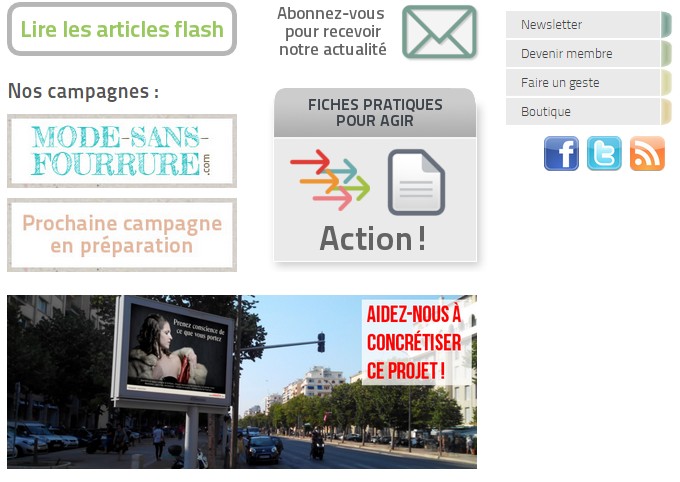 - Enfin, nous relayons la pétition de l’un de nos partenaires pour demander la fin des élevages à fourrure en France, qui comporte déjà plus de 35 000 signatures. Il faut savoir que 14 députés soutiennent cette initiative réaliste et ont à cet effet déposé en février 2013 une proposition de loi qui est malheureusement à ce jour toujours bloquée dans les tiroirs de l’Assemblée Nationale.
