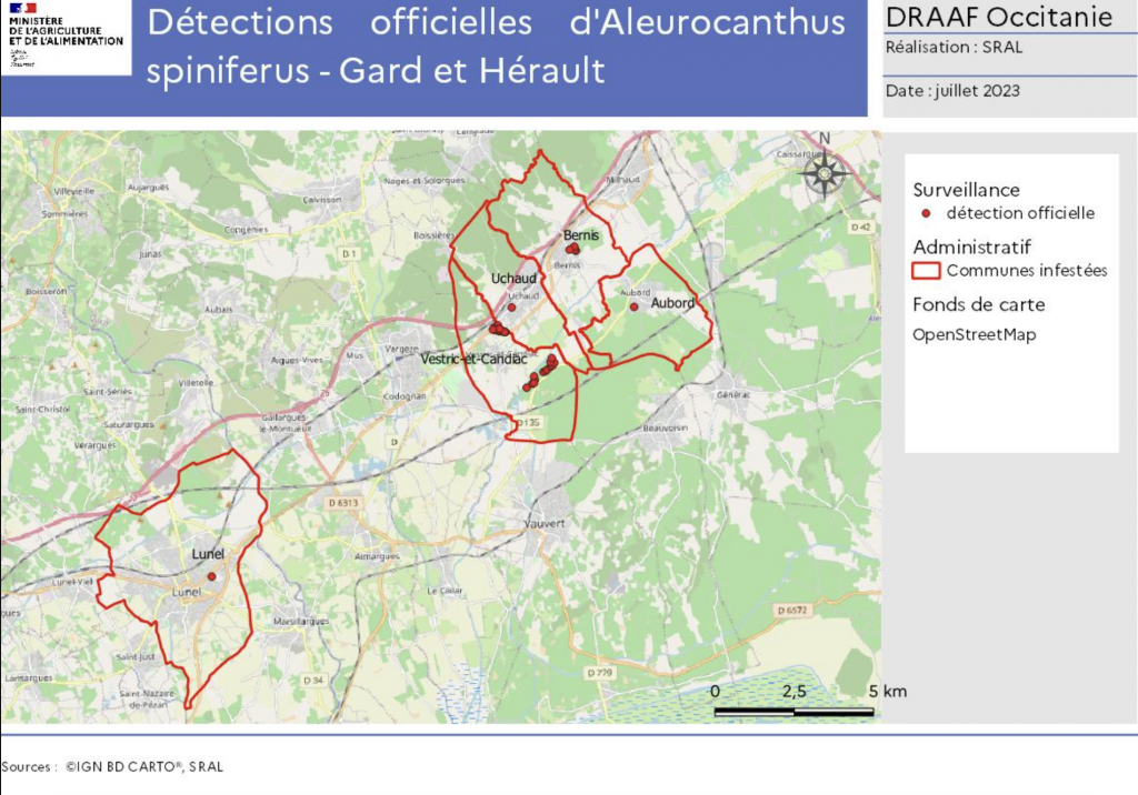 Suite à un signalement initial suspectant la présence de cet insecte, la Direction régionale de l’alimentation, de l’agriculture et de la forêt – Service régional de l’alimentation (DRAAF-SRAL) a confirmé la présence de l’aleurode épineux du citronnier dans plusieurs communes : Aubord, Bernis, Uchaud et Vestric-et-Candiac, toutes situées dans le département du Gard, ainsi que Lunel, dans l’Hérault.