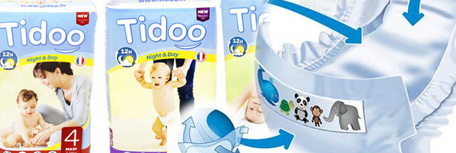 La marque TIDOO se positionne clairement sur le segment des couches écolo : sa gamme Night&Day est une gamme de couches jetables anti-fuites, écologiques et fabriquées en France.