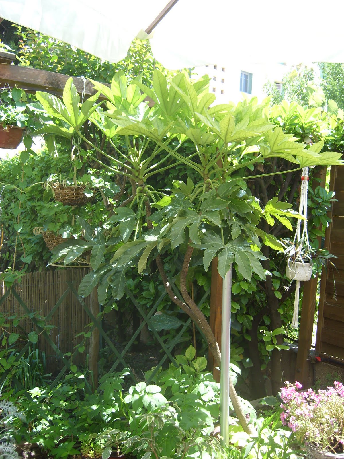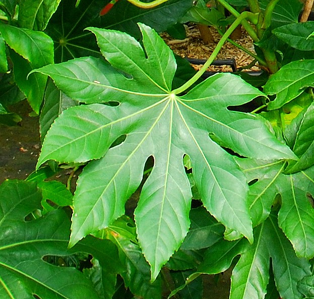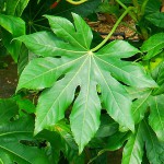 – L’aralia ou fatsia japonica est une plante au feuillage persistant qui pousse en intérieur ou bien en pleine terre dans un endroit ombragé.
