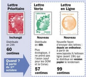 Pas besoin de toujours faire parvenir son courrier en 24 heures. Pas besoin donc de payer le prix fort (le timbre poste rouge à 0,60 €) et son mode de transport ultra rapide, consommateur d’énergie et de coûts. La Poste a enfin sorti le 1er octobre 11, un timbre poste Lettre Verte, plus économe, et juste un peu plus lent.