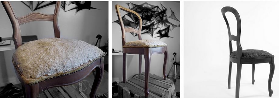 Teddy Launay pour sa conception « Cellulose chair », une chaise recyclée sur le principe de l’upcycling suscite le débat sur la réhabilitation de meuble en fin de vie, puis sur la création de matériaux à base de déchets. L’assise de la chaise est constituée d’une pâte de cellulose obtenue à partir du mélange de boite à oeufs, de papier et de carton mélangé à de l’eau.