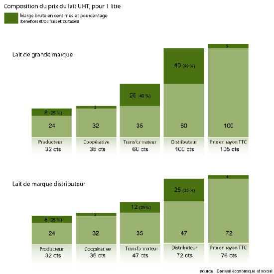 Aujourd’hui en rayon, une brique de lait de marque de distributeur coûte à peu près 70 centimes d’euros, une brique de grande marque à peu près 1€.